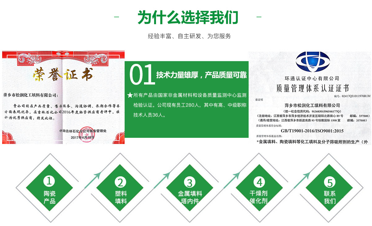 萍鄉(xiāng)市松潤(rùn)化工填料有限公司位于江西省萍鄉(xiāng)市國(guó)家經(jīng)濟(jì)開發(fā)區(qū)西區(qū),是專業(yè)生產(chǎn)、經(jīng)營(yíng)陶瓷、聚丙烯、金屬填料、塔內(nèi)件、水處理濾板、濾管、濾料、瓷球、分子篩、催化劑、活性炭、蜂窩陶瓷、瓷質(zhì)耐磨托輥等系列產(chǎn)品的民營(yíng)企業(yè)。所有產(chǎn)品由國(guó)家非金屬材料和設(shè)備質(zhì)量監(jiān)測(cè)中心監(jiān)測(cè)檢驗(yàn)認(rèn)證。公司現(xiàn)有員工280人,其中有高、中級(jí)職稱技術(shù)人員36人。工藝先進(jìn),技術(shù)力量雄厚,產(chǎn)品質(zhì)量可靠,配...